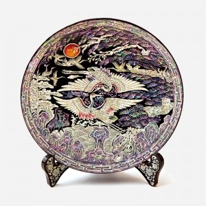 - 자개를 이용하여 소나무와 쌍학의 모습을 담은 소형 나전칠기 원형쟁반 입니다. 고급 받침이 함께 제공됩니다.