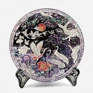 자개를 이용하여 소나무와 쌍학의 모습을 담은 소형 나전칠기 원형쟁반 입니다. 고급 받침이 함께 제공됩니다.